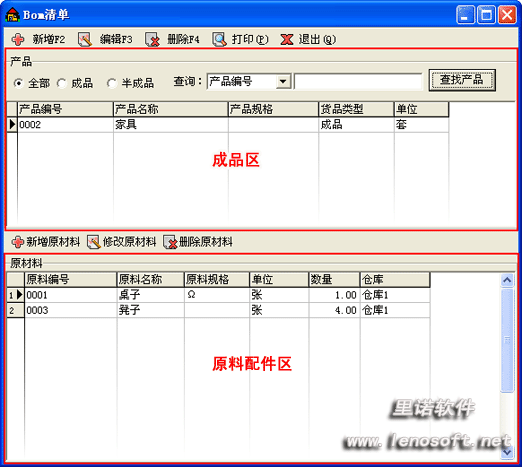 產(chǎn)品配料單是在做生產(chǎn)加工單和生產(chǎn)拆卸單之前需要完成的一個重要的工作。里諾倉庫3000管理軟件擁有最好用的產(chǎn)品BOM單添加及管理。此版面分兩個區(qū)域,上方為加工完畢后的貨品信息錄入?yún)^(qū)域,我們也考慮到了,加工好的也不一定是成品直接出庫了,也存在加工后還是半成品還需要進一步加工的情況;下方區(qū)域則為原材料添加區(qū),依據(jù)產(chǎn)品所對應的編號的貨品,您可在下方添加您所需要加工的原材料、配件等,還包括今后調(diào)撥的倉庫、以及所選原料的個數(shù)等。區(qū)域分明,并可根據(jù)產(chǎn)品配料單打印對照,方便今后維護管理。