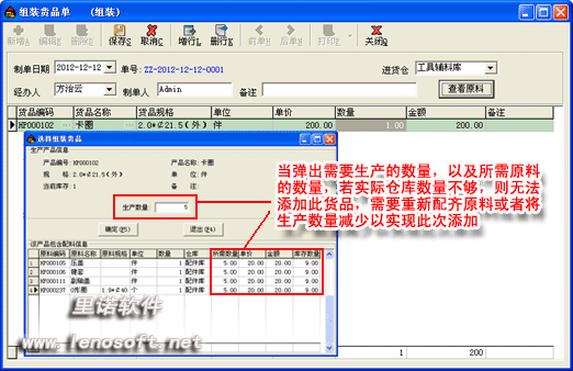 當你選擇需要組裝的貨品時候,會彈出需要生產(chǎn)的數(shù)量,以及所需原料的數(shù)量,若實際倉庫數(shù)量不夠,則無法添加此貨品,需要重新配齊原料或者將生產(chǎn)數(shù)量減少以實現(xiàn)此次添加。