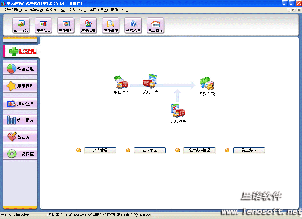 1> 下面我們以進貨管理為例,講述如何制做入庫單.點擊里諾進銷存導(dǎo)航界面上的【進貨管理】,再點擊【采購入庫】按鈕,如下圖所示: