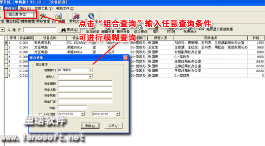 您可以對需要查找的設(shè)備項目進行模糊查找,點擊“組合查詢”輸入任意的查詢條件點擊“查詢”即可顯示查詢結(jié)果。