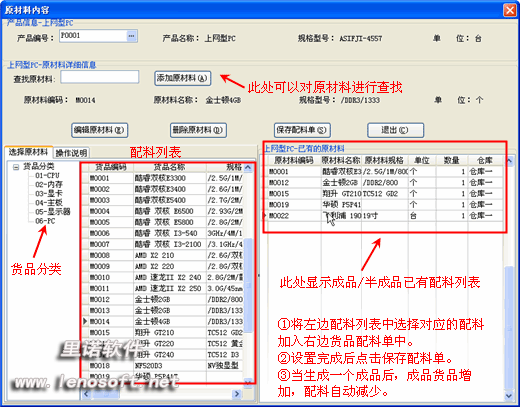 下面原材料信息部分是上面選擇的產品所對應的配料信息。點擊上方的產品可顯示出此產品的配料信息。雙擊上方產品信息可以彈出中的配料添加部產品: