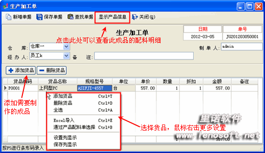 ③當生成一個成品后,成品貨品增加,配料自動減少。具體操作說明詳見軟件