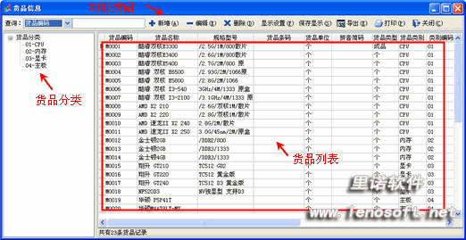 在貨品信息窗口中左邊是貨品類別,右邊列表中是該類別對應的貨品。在某一類別上點擊鼠標右鍵,可以新增類別,重命名和刪除類別。