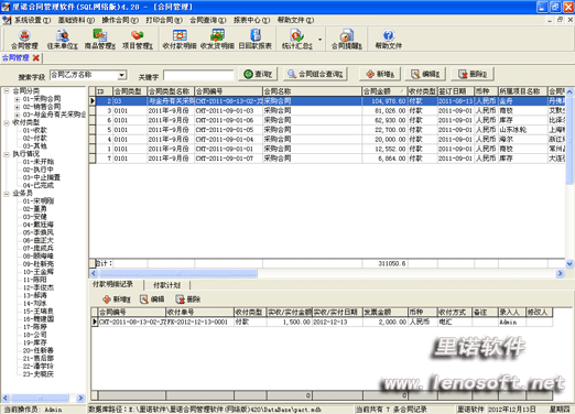 里諾合同管理軟件(SQL網絡版)是一款可以架構在局域網內多臺電腦數據共享操作使用的合同管理軟件。軟件集合同起草、合同簽訂、合同收付款計劃,合同收付,結算安排、執行進展、到實際結款以及對合同結款情況統計分析功能于一體的管理軟件。軟件界面簡潔直觀,功能齊全,可方便的幫助你對供貨商和客戶的合同進行管理,協助您完成應收應付款分析,自動統計所有供貨商和客戶的應收應付款額,為您大大節省工作時間,提高工作效率。里諾合同管理軟件將是您明智的選擇,將會是你合同管理的好助手!