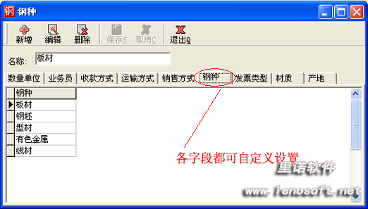 基本資料的錄入能更直觀的管理每一項鋼材的基本屬性。如名稱、規格型號、材質、產地、貨位、庫存上限與庫存下限等。